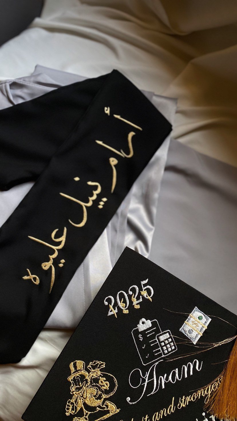 وشاح تخرج أنيق 2026 من حروف النسيج، خامة فاخرة وتطريز متقن ليمنحك إطلالة فريدة في يوم التخرج.