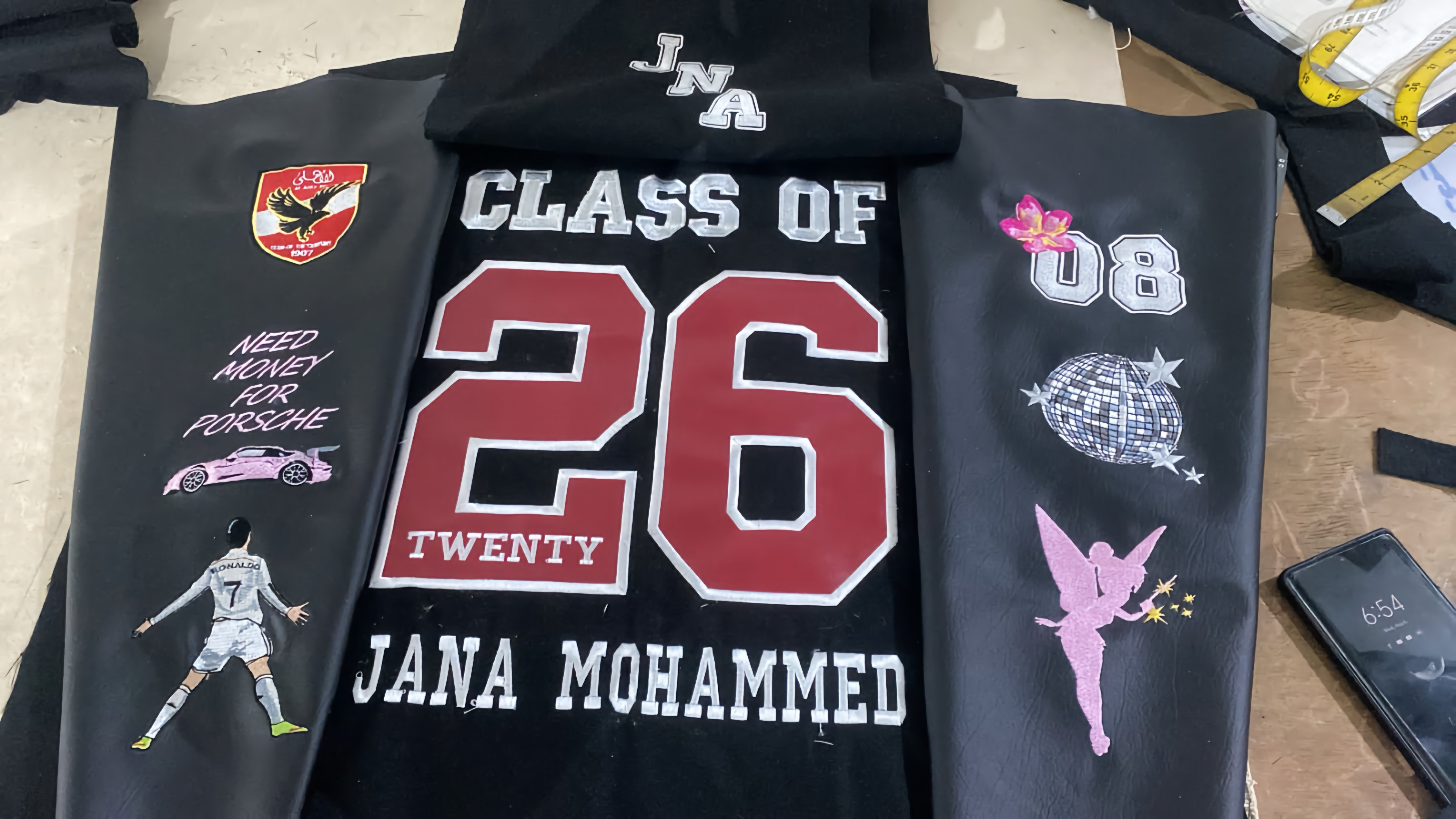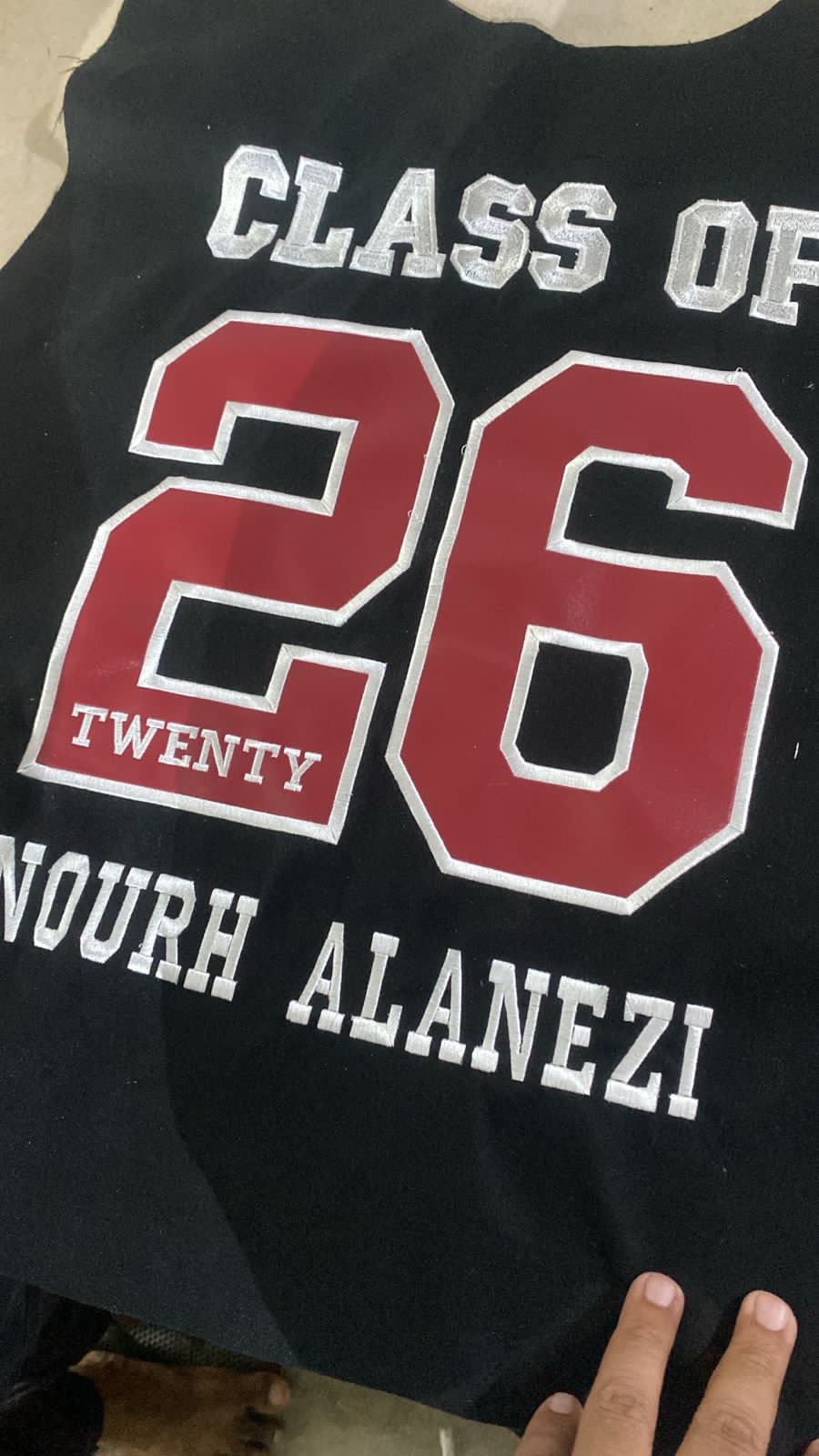 تطريز وتصميم مخصص: اجعل إطلالتك فريدة من نوعها! نحن نقدم خدمات تطريز مخصصة مع مصنع حروف النسيج الرائد، حيث يمكنك إضافة اسمك، تاريخ تخرجك، أو أي تصميم آخر ترغب به، مما يعكس هويتك وفرحتك بشكل مميز.